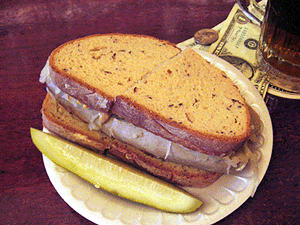 Anyone who knows a schnitzel about Chicago food is aware that The Berghoff, 17 W. Adams St., was until 2006 one of the busiest restaurants in the city due to its incredible menu, professional wait staff that used restaurant-specific currency, and an incredible bar that received the first post-prohibition liquor license in the city. Greasefreak dutifully qeued up to the bar's famed carving station day after day, ordering delicious cod, turkey, corned beef, roast beef, meatloaf, and sauerbraten sandwiches. My old standby, though, was the exquisite veal bratwurst, split lengthwise and served with sauerkraut on rye bread. I'd add a little Dusseldorf mustard, squeeze into a tight spot at the bar, and lunch elbow-to-elbow with other blissful diners.