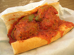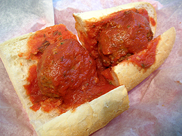I prefer a pair of meatballs -- which makes the sandwich easy to cut in half -- served on an open, crunchy baguette, without cheese or other extras save for a marinara sauce and sprinkle of Parmesan. Obscuring their flavor with condiments, and their form with bread, just spoils the meatball magic. On with the show.