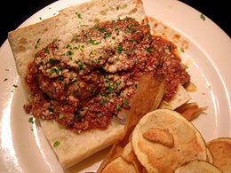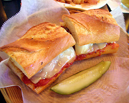 Club Lago, 331 W. Superior St. TASTE: ![]() ![]() ![]() PRESENTATION: ![]() ![]() AMBIENCE: ![]() ![]() ![]() ![]() A panini-style sandwich that tastes great but lacks visual appeal. The side salad is a nice touch but I'd rather Lago emphasized the meat as much as the palette cleanser. Haray Caray's, 33 W. Kinzie St. TASTE: ![]() PRESENTATION: ![]() AMBIENCE: ![]() ![]() ![]() ![]() Another cheesey, panini-style sub with sliced balls that I would rather avoid. I have no idea why the chef thinks pickles and meatballs go together. |
